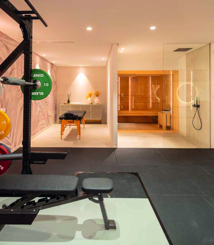 The home gym features a multi-use squat rack with built-in chin up bar and a dip-rack attachment, Eleiko’s signature barbell, and convenient storage shelves for a range of free weights such as kettlebells, dumbbells, and weight plates. The cardio station consists of Concept 2 Rower and an Assault Bike – resulting in a home gym that is every Weightlifter, Crossfitter or daily exerciser’s dream. This luxury gym also includes a Massage area, a Sauna and walk-in Shower area which all adds to the luxuriousness of the home.
